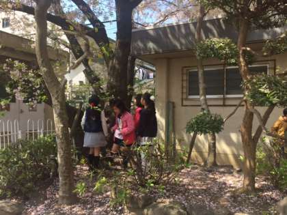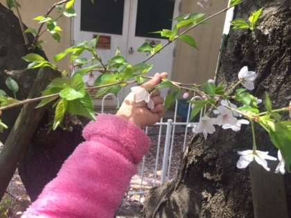 風に吹かれて落ちてくる桜の花で遊んでいる子どもたちもいました。「ここにまだ、桜の蕾がある!」「花びらが4枚のと5枚のとあるよ。」と教えてくれました。