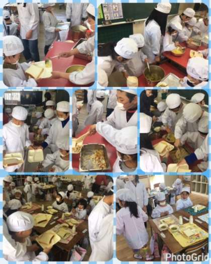 今日のグラタンは配膳するのが難しいようで、6年生が手を添えて教えてあげながら配膳していました☆☆☆