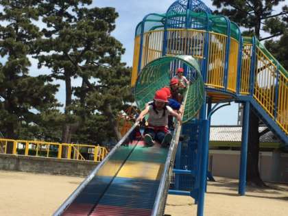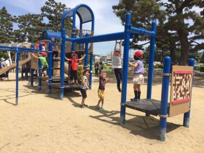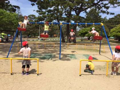 お弁当とおやつが終わった子どもから順に、また、遊具での遊びタイムが始まりました。始めとはまた違う場所です。しっかり遊んだ子どもたちは、少し疲れたようでしたが、行きも帰りも電車の中ではたいへん静かに過ごすことができ、周りの方から褒めて頂きました。