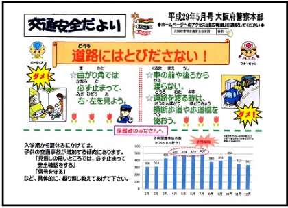 大阪府警察本部から出ている「交通安全だより」5月号を掲載しました。4月〜7月は子ども関連事故件数が多発傾向にあるそうです。この便りを参考に是非ご家庭でも話し合ってください。  →こちらをクリックしてご覧ください。