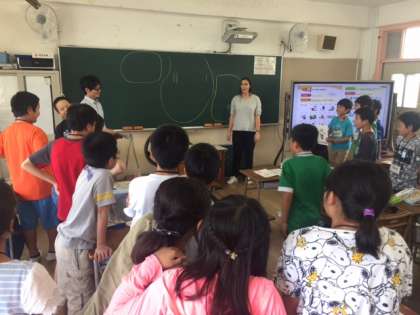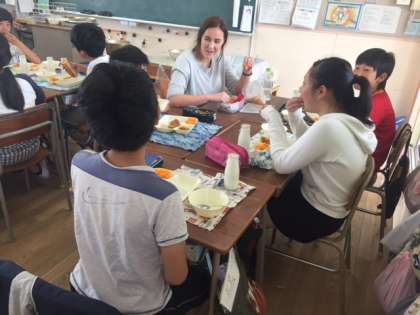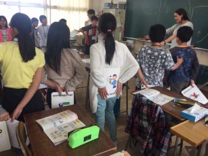昨日は6年生がC-NETのGaby先生と英語活動をしました。テーマは“I can swim.”でした。途中、子どもたちは二つのチームに分かれ英語ゲームを楽しんでいました。相手に見えないようにカードを持ち、背中合わせに立ちます。カードには“play Baseball”“play table tenis”“play kendama”などの英文が書かれてあります。“One Two Three”とお互い三歩離れたら振り返り、カードを見せ合います。相手のカードに書かれている英文を早く読めた人が勝ちというルールです。チーム対抗なので、一回一回子どもたちは一喜一憂です。小学校では楽しく英語に親しんでほしいと思います。Gaby先生は「ランチも子どもたちと一緒に食べたい。」と、昨日は6年2組で昼食をとっておられました。