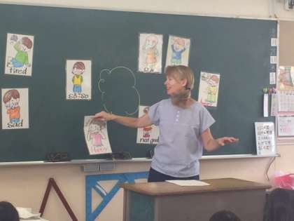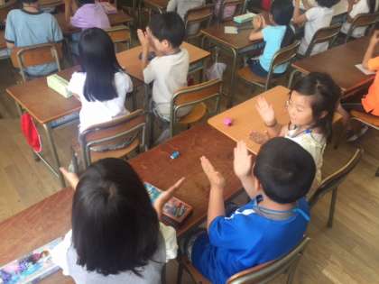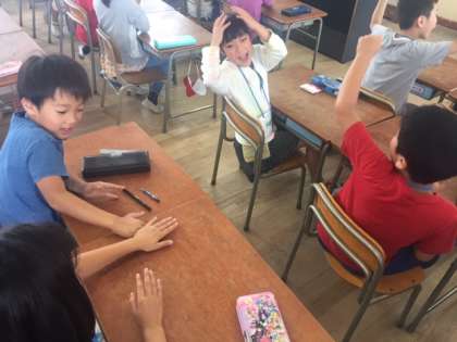 “angry”“tired”“sad”“so−so”などのカードの発音をアンジェラ先生に続いて発音します。その後、Keywordを決め、アンジェラ先生がそのKeywordを発音したら、隣同士で二人の間に置いた消しゴムをすばやくとった方が勝ちというゲームをしました。