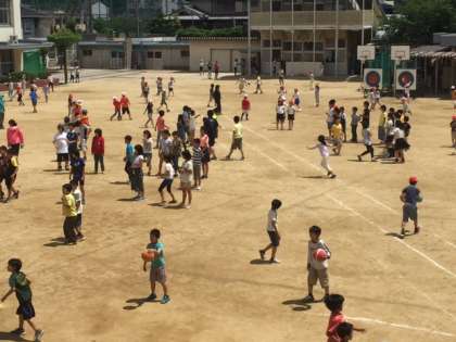 運動場でも、多くの子どもたちが遊んでいます。クラスで長縄をして遊んでいる子、ボール遊びをしている子、おにごっこをしている子。少々暑くても子どもたちは元気に遊んでいます。