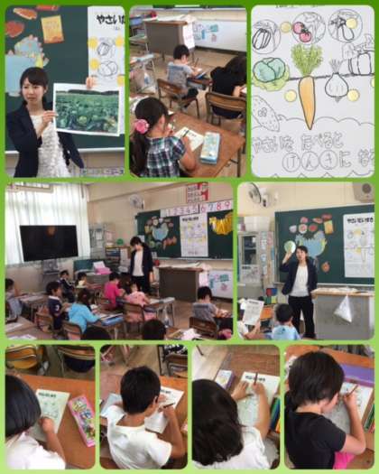 最後にみんなで、大きな声で『野菜を食べると元気になる!!!』と言いました。野菜は体の調子を整える働きをします。ご家庭でも野菜を始め、いろいろな食べ物を好き嫌いなく食べられるよう子どもたちとお話してください。