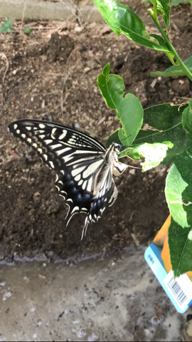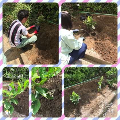 3年生が教室で、アゲハチョウや、カイコを育てています。彼らの食べ物である、かんきつ系の樹木や、桑の木が本校にはなかったので、今日、管理作業員さんに、「レモン」「キンカン」「スダチ」「クワ」の苗を植え付けてもらいました。その途端まるで待っていたように、アゲハチョウが卵を産み付けにやって来ました。