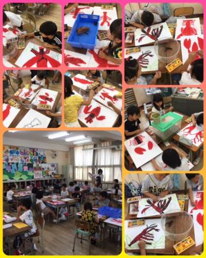 班ごとにザリガニを置き、よく観察しながら、画用紙いっぱいに描いていました(^o^)