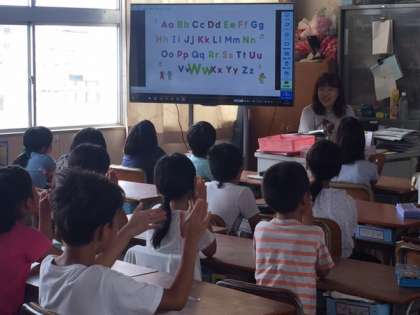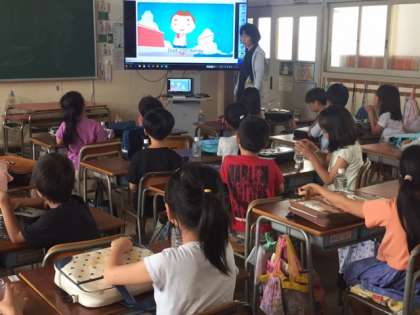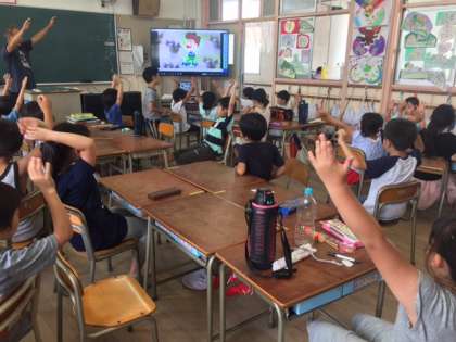 4月から始めた月・水・金週3日間の英語モジュール学習が子どもたちにも定着してきました。13時35分になると、各教室からDVDに合わて英語の学習をする子どもたちの声が聞こえてきます。