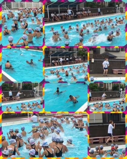 まず、水慣れとして、アクアビクスをしていただきました。リズムに乗って子どもたちは大喜び。楽しく準備運動ができました。後半はいつもと同じように泳力別練習です。「全体的に泳力が高いですね。」とほめていただきました。インストラクター経験がおありの保護者の方にもお越しいただき、アシスタントをしていただきました。お天気が良ければ、12日、19日に他学年でも指導していただきます。
