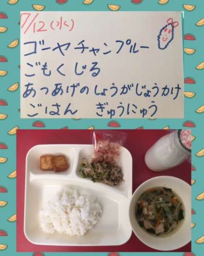 『ゴーヤチャンプル』は、給食で年に一回だけ7月に使用できる、にがうりを使った沖縄料理です☆☆☆