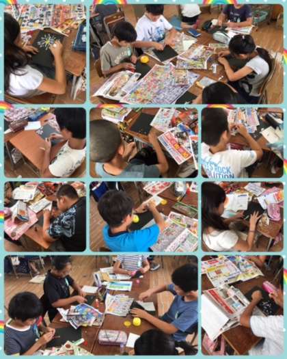 チラシを細かくちぎって黒の画用紙に貼っていきます・・・
