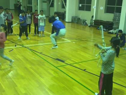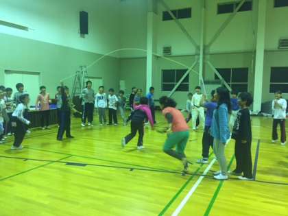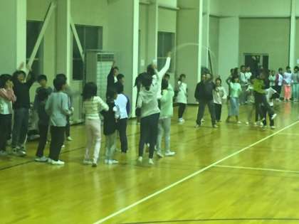 今日の夜のプログラムは、ナイトハイク、星の観察だつたのですが、夕方までの雨の為実施できず、体育館で室内レクレーションをしています。活動の合間に、担任の先生たちが、知恵を出し合い、子どもたちを楽しませるために、いろいろなアイディアを出し、準備をしていました。いまはわ、クラス対抗で、長縄跳びをしています。