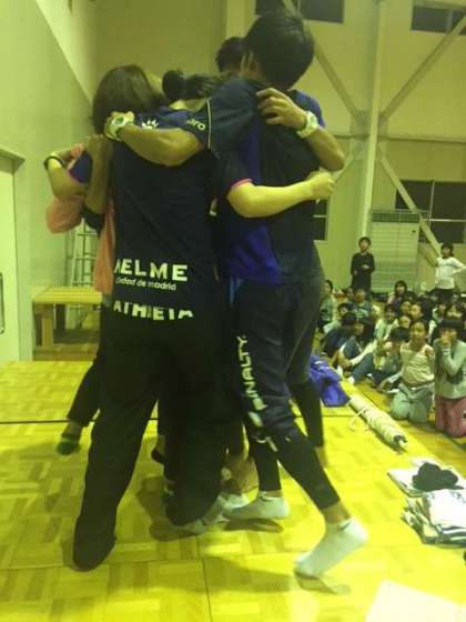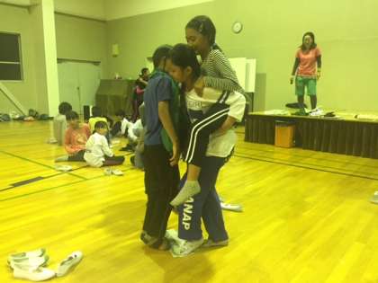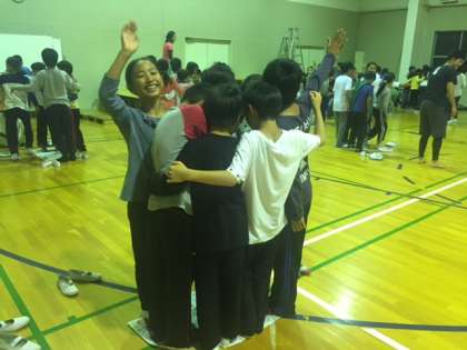 2種目目は、1枚の新聞紙にグループの友だち全員が乗るというゲームです。爪先を乗せ、反対の足が宙に浮いていても、OKです。乗る新聞紙の大きさはだんだん狭くなります。先生たちの見本もなかなかのものでした。