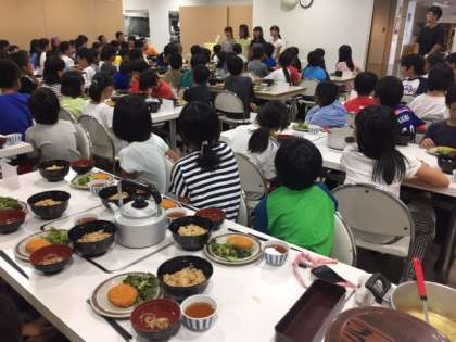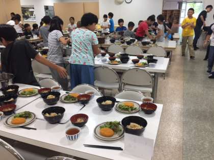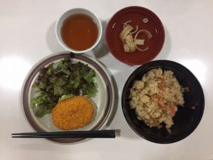 いよいよ最後の食事です。炊き込みご飯、サラダ、コロッケ、おすましです。食事係が、手際よく準備し、座って待っている余裕がありました。