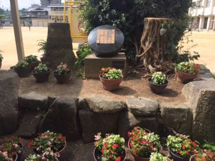 26日の記事でお知らせしていたように、29日(土)に業者の方にお願いし、2本のヤシの木を伐りました。創立50周年記念のモニュメントの両脇をヤシの木の切り株が守ってくれているようです。