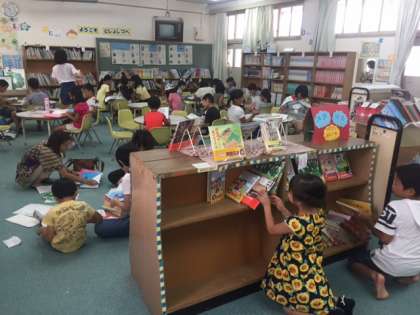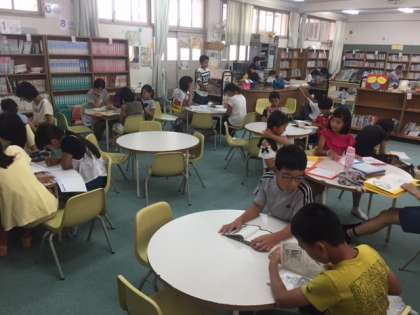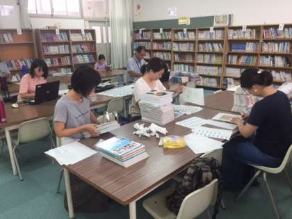 7月24日〜27日までの4日間は教職員に加え、PTA役員の方々やPTA図書委員会の方々にも手伝っていただきながら作業を進めました。プール指導の前後に子どもたちが本を読みに来るので、処理が終わった本と終わっていない本が混じらないように気をつけながらの作業でした。