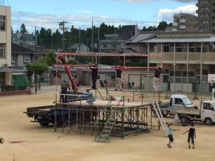 8月5日(土)6日(日)にかけて、本校運動場で開催される「南田辺まつり」に向けて、櫓の組み立てが行われています。猛暑日が続く中、地域の皆さんは着々と準備を進めておられます。