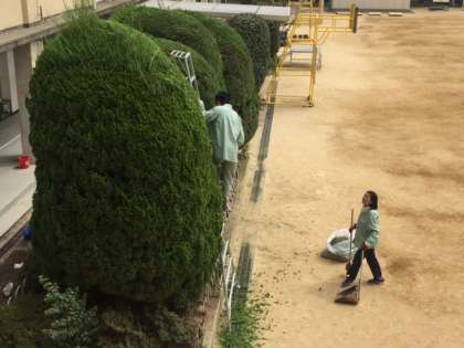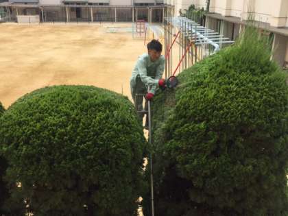 管理作業員さんが、校庭の樹木の剪定をしてくれました。カイヅカイブキの枝を切っていると1年生の子どもが「いいにおい!」と言って横を通って行ったそうです。美しい学校でこそ、子どもたちは落ち着いて学習をすることができます。夏休みに、玄関の門扉を塗り替えたり、毎日校舎周りを清掃したり、破損個所の修理をしたりして、子どもたちが安全に、気持ちよく過ごせるように、本校では二人の管理作業員さんが環境整備をしてくれています。
