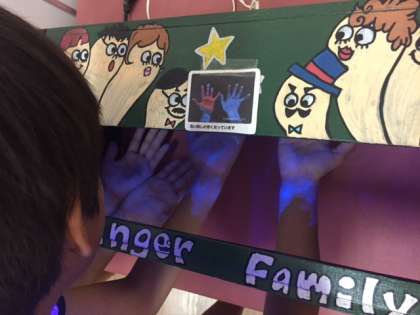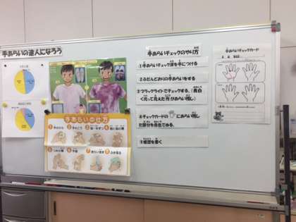 二測定が始まりました。今日は6年生でした。二測定の前には、養護教諭の先生による保健指導があります。今回のテーマは「手洗いの達人にになろう」です。二測定が終わった子どもから、手洗いチェック液を手につけてもらい、ふだんどおりの手洗いをします。その後、ブラックライトで各自チェックします。掌はかなりきれいになっていましたが、手の甲や、手首に汚れが残っている子どもが多く、子どもたち自身驚いていました。健康を維持するために、口から細菌が体内に入り込むことを防がなければなりません。そのためには手洗いをしっかりすることが大切です。養護教諭の先生は、「一生のうちで最後の手洗い指導になるかもしれません。意識しなくても丁寧に手洗いができるようになりましょう。」と子どもたちに話していました。