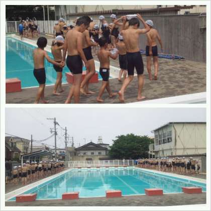 南田辺小学校では例年、1年生の初回のプールに6年生といっしょに入ります。