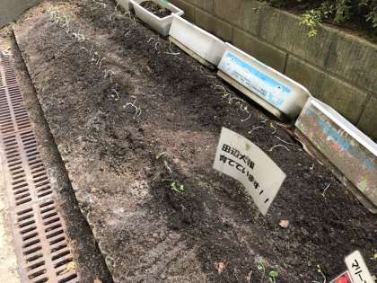 そんな中で、先日3年生が種まきをした田辺大根はどうなっているかなと心配でしたが、無事発芽していました。先週末管理作業員さんが、種まきの直後なので、種が雨に流されないようにと、畝に段ボールで囲いを作ってくれていたおかげだなと思います。