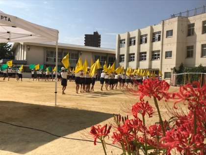 運動会の練習も仕上げの段階になりました。5年生が「南田辺ソーラン〜let,s try〜」6年生が「全全全力〜はばたく未来へ〜」の練習をしていました。どちらの学年も、先生が仕上がり具合をビデオ撮影し、子どもたちがそれを見ることで新たな課題を見つけ、本番に向けてさらに技を磨くという指導を今後するようです。始めは先生方に教えてもらうばかりでしたが、今度は自分の感性でさらに表現を磨く学習に入ります。校庭に咲いた彼岸花も子どもたちの頑張りを応援しています。