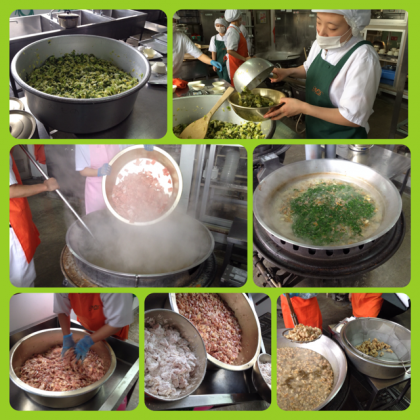 キャベツと三度豆はそれぞれ茹で、砂糖・塩・酢・薄口しょうゆを煮て作ったタレをかけあえて配缶します☆