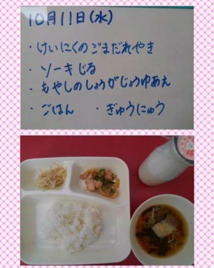 『鶏肉のゴマだれ焼き』は鶏肉、たまねぎ、ピーマンを練りごま、砂糖、みりん、こいくち醤油で下味を付け、ホテルパンに並べ、いりごまをふり焼きもの機で焼きます☆☆☆