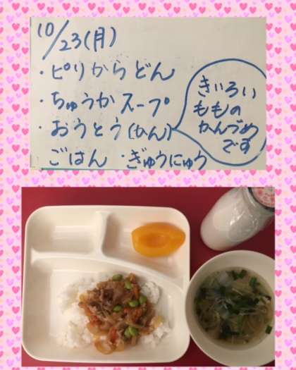 ピリ辛丼は豚肉を主材に、たまねぎ、にんじん、彩りにむき枝豆を使っています☆