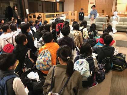 入舎式では、宿舎 みち潮 の方とご挨拶した後、新入社員の「かしこちゃん」から、宿舎についての説明がありました。子どもたちは興味津々、しっかり聞いていました。