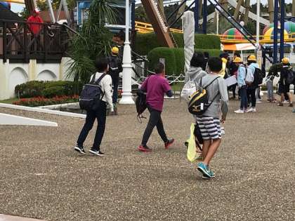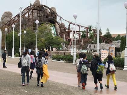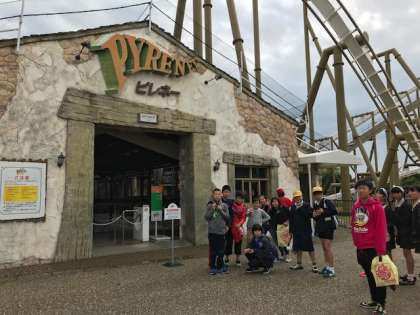 雨が降っていたため運転を見合わせていたアトラクションが開始されました。ピレネーの一番乗りは南田辺小学校の子どもたちです。
