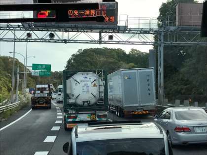 3km先、点検作業中という表示が出ています。渋滞に巻き込まれています。