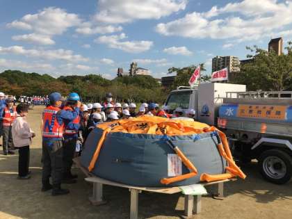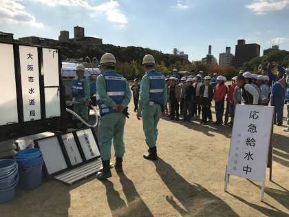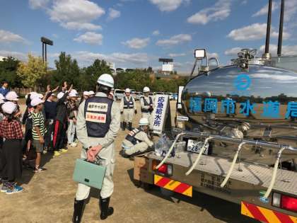 昨日(10月31日)、5年生は四都市(大阪市・東京都・福岡市・神戸市)水道局合同訓練に参加させていただきました。上町断層を震源とする直下型地震が発生したため、水道管が破損し、大阪市全域で断水が発生しているという想定で、○応急給水訓練 ○応急復旧訓練 ○四都市相互応援体制の強化訓練が行われました。子供たちは非常用の飲料水を入れるパックをいただき、全員給水体験をさせていただきました。皆さんご存知の通り、長居公園の自由広場の地下には大きな配水池が設置されています。もし、大きな地震が発生して断水になった場合はこの配水池から水をもらうことになります。水道局の方は「地震が発生した時には、お父さんやお母さんは家の片づけでとても忙しいから、水をもらいに来るのはあなたち子どもがお手伝いしましょう。」とおっしゃっていました。最大6リットル入るパックに子どもたちは思い思いの量の水を入れていました。水は朝、柴島浄水場から給水車に取水してきたものだそうです。