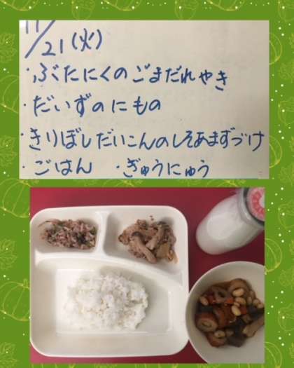 『食物繊維たっぷりの切り干しだいこん、きのこ、大豆、れんこん、ごまなどを使って、おなかの中をスッキリさせる健康メニュー』をテーマに考えられた献立だそうです♪♪♪