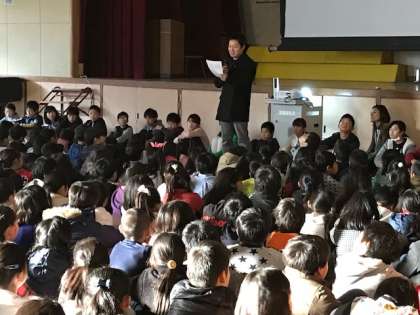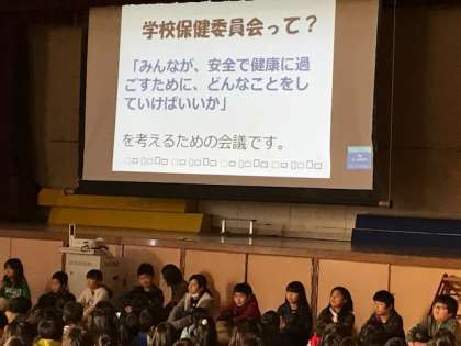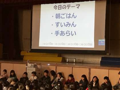 木曜日の児童集会の時間を活用して、学校保健委員会を開催しました。学校保健委員会とは先生、子どもたち、学校医の先生、おうちの方々で、「みんなが、安全で健康に過ごすために、どんなことをしていけばいいか」を考えるための会議です。今回のテーマは、「朝ごはん、睡眠、手洗い」についてでした。保健委員会の子どもたちが、子どもたちにインタビューしたり、調べたりしてわかったことをプレゼンテーションした後、学校医の和田先生から