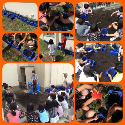 トマトは先生の説明を聞いた後、自分の鉢に植えました☆