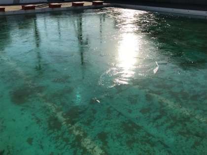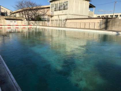 過去最強の寒波が日本列島を覆い、寒い毎日が続いています。今日1年生の女の子が氷の塊が入った紙コップを見せてくれました。お家でできていたそうです。1年3組の廊下にも数日前から、水を入れた容器をいくつかおいて子どもたちが観察していますが、この寒さの中でも、氷は張っていません。プールはどうかなと思い、児童集会の後、見に行ってみると、東側半分だけ氷が張っていました。