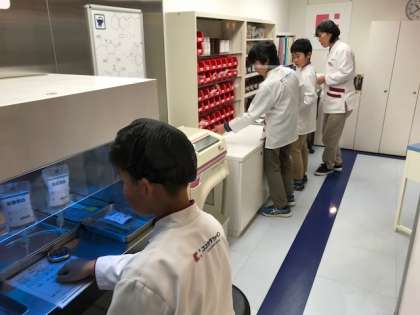 商品開発、自動販売機への飲み物の補充、薬剤師さんの仕事なども体験しました。