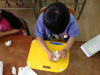 手のひらを使って丸めたり、のばしたり、指先を使って形を作ったりと、自分の作りたいものに合わせて、いろいろ工夫をしていました。