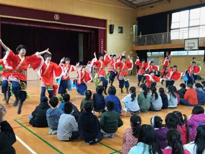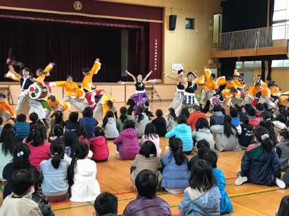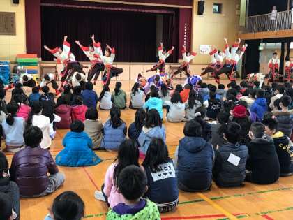今日はPTA主催毎年恒例の「冬フェス」が開催されました。第一部は大学生のお兄さん、お姉さん等による「こいや祭り」でした。四つのグループが来てくださいましたが、どのチームも活気あふれる踊りでした。途中、子どもたちも参加できる「南中ソーラン」もありました。最後に「エブリバディ こいや」をみんなで躍りました。