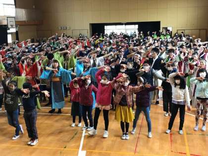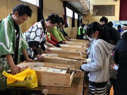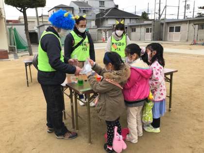 「 冬フェス」第ニ部、子どもたちは、各コーナーを回って、ゲームやフェイスペインティング、スライム作りなどを楽しんでいました。PTAの方々と一緒に、こいや祭りの出演者のうち何人かの方々が、店番をしてくださっていました。