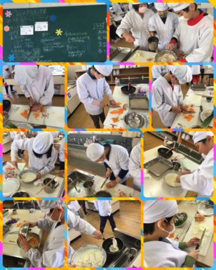 野菜をカットする人・・・粉をとく人・・・班ごとに協力しあいながら、実習をすすめていました☆☆☆