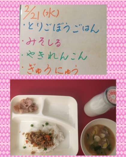 『鶏ごぼうご飯』は、しょうが汁で下味をつけた鶏挽肉を主材に、つきこんにゃく、ごぼう、にんじん、グリンピースを使用した混ぜご飯です☆☆☆