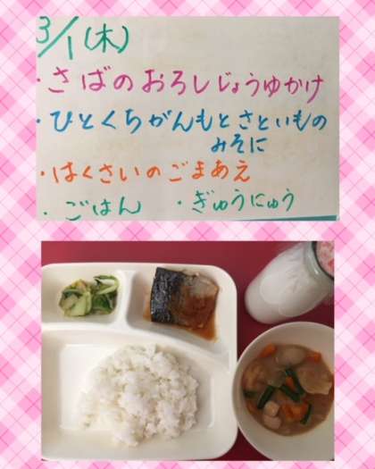 『さばのおろしじょうゆかけ』は、しょうが汁、料理酒で下味をつけ、焼き物機で焼いたさばに、大根おろし、みりん、こいくちしょうゆを合わせて作ったタレをかけ、さっぱりと食べやすくしています☆☆☆