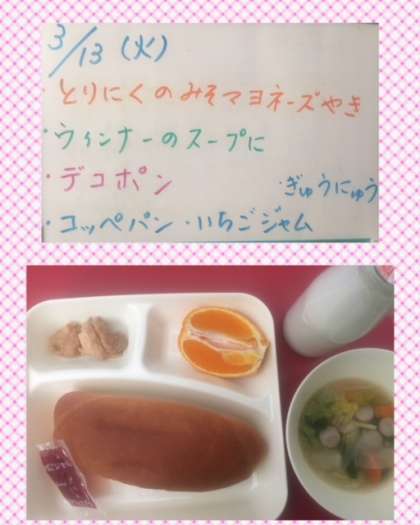 献立表では、清見オレンジでしたが、天候不良の影響で、給食で使用分の供給ができず、デコポンに変更になっています。