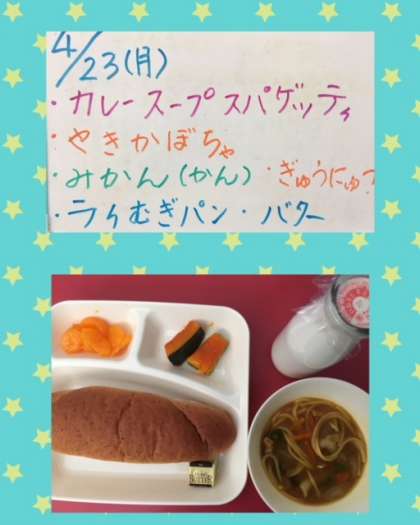 『カレースープスパゲティ』は、鶏肉とベーコンを主材にした子ども達も大好きなカレー味のスープスパゲティです☆☆☆