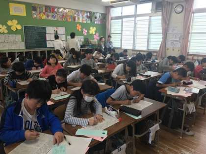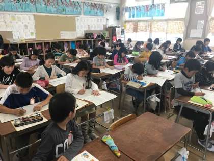 5時限目の学習参観の前に、毎週火曜日に全校一斉に行っているぐんぐんタイム「視写」の様子も見て頂きました。15分間集中して1年生から4年生までは教科書の文章を、5年生、6年生は朝日「天声人語」を視写します。美しく、そして正確に子どもたちは真剣に鉛筆を走らせています。