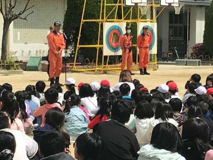 給食室から出火、燃え広がる可能性があるという想定で、避難訓練を実施しました。ハンカチで、口を覆い、素早く避難することができました。東住吉消防署から来てくださった消防士さんから、「今日は口をハンカチできちんと抑えて、とても素早く行動できていました。でも、一人でいる時に火災が起こる事があるかもしれません。そんなときにも、今日のように落ち着いて行動しましょう。」とお話をしていただきました。