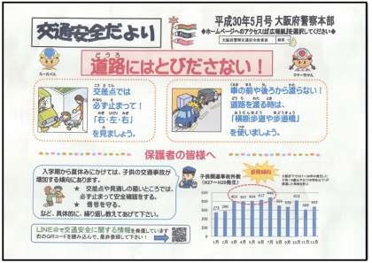 大阪府警察本部より、毎月「交通安全だより」と「交通安全テスト」が届きます。「交通安全テスト」は、(1・2年生用)(3.4年生用)(5・6年生用)にわかれており、それぞれ詳しい解答と解説がついています。交通事故から身を守るため、ご家庭でもお子さんと一緒に交通安全について話し合う資料にしてください。学校ホームページ右側の「配布文書」に掲載しています。