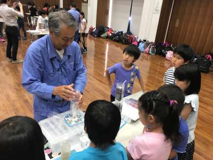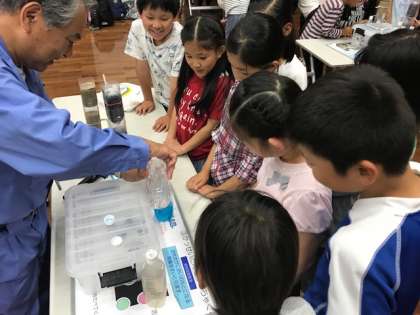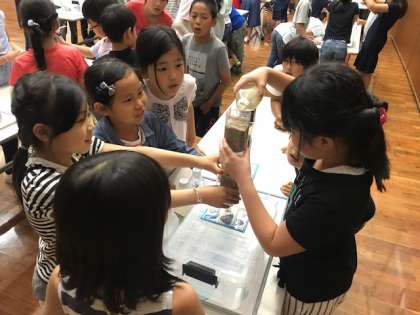 昼食が終わると、浄水場のことをわかりやすく説明した映像を見せていただきました。その後、淀川から組み上げられた水がきれいになっていく様子を学ぶために実験をさせていただきました。ペットボトルに砂の層を二層作り、泥水を流し込みます。濾されて出てきた水は何と透明です。でも匂いがまだ残っているということで、透明の水に匂いに見立てた青い色を付け、今度は活性炭の層へ流して濾過します。水色の水がまたまた、透明になって出てきました。手品のような出来事に子どもたちは、びっくりです。