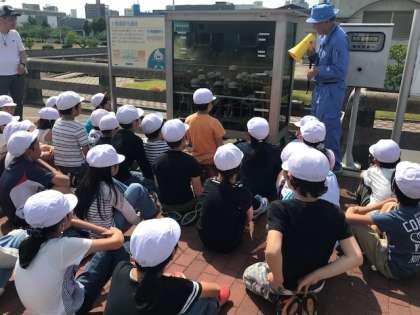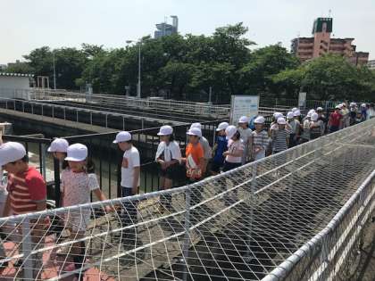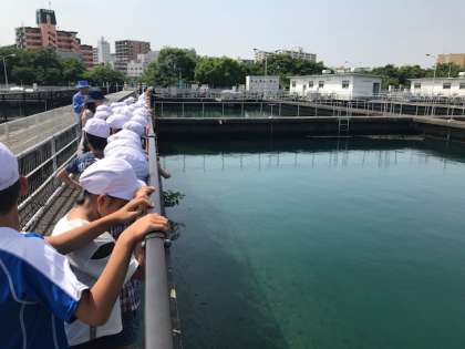 実験を終え、浄水場の施設を見学させていただきました。1クラスにお一人ずつ係の方がついてくださり、丁寧に説明してくださいました。